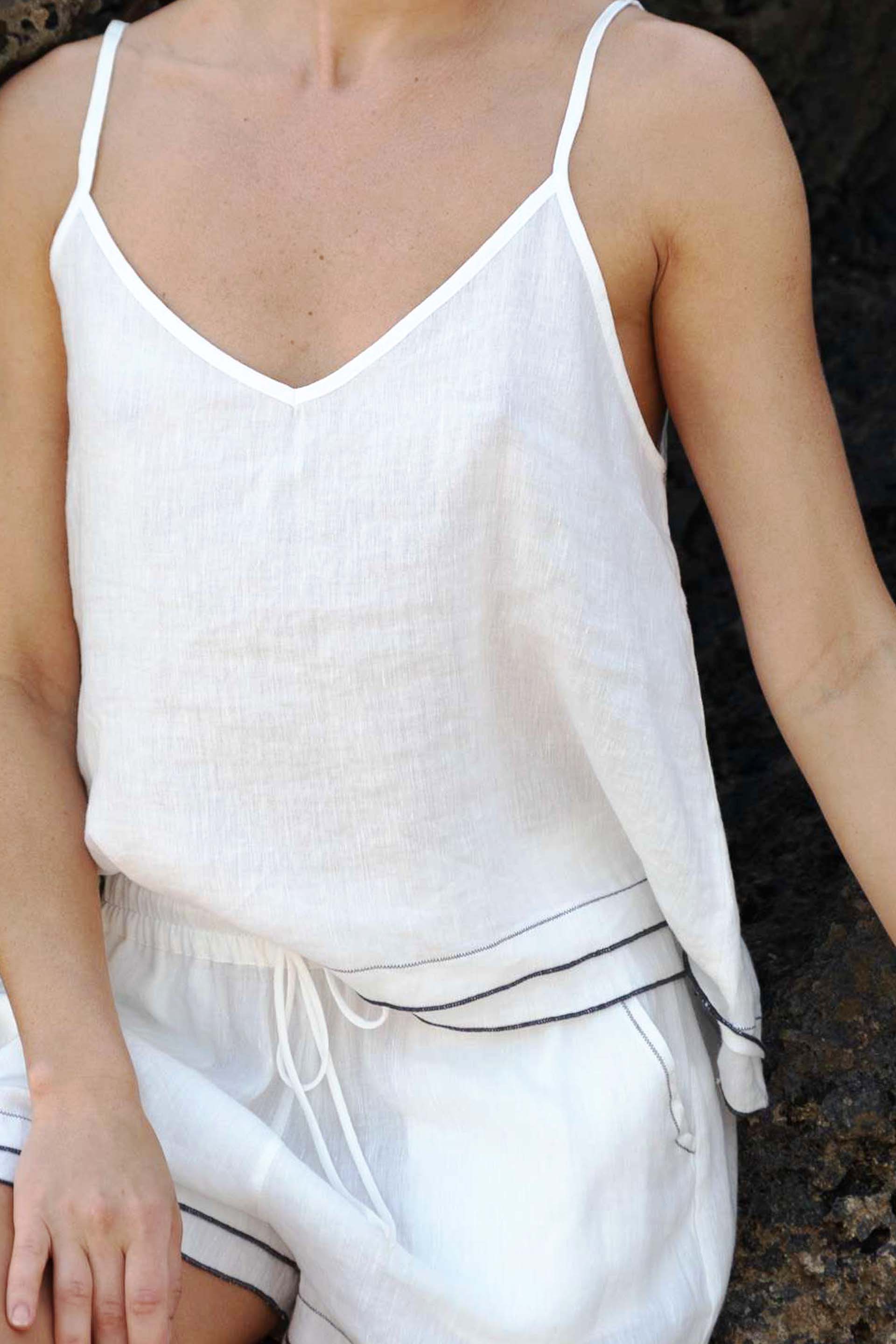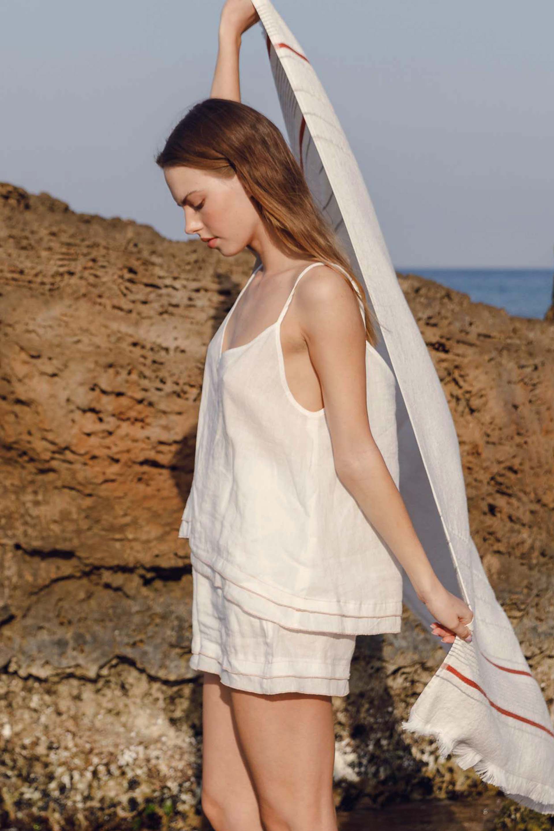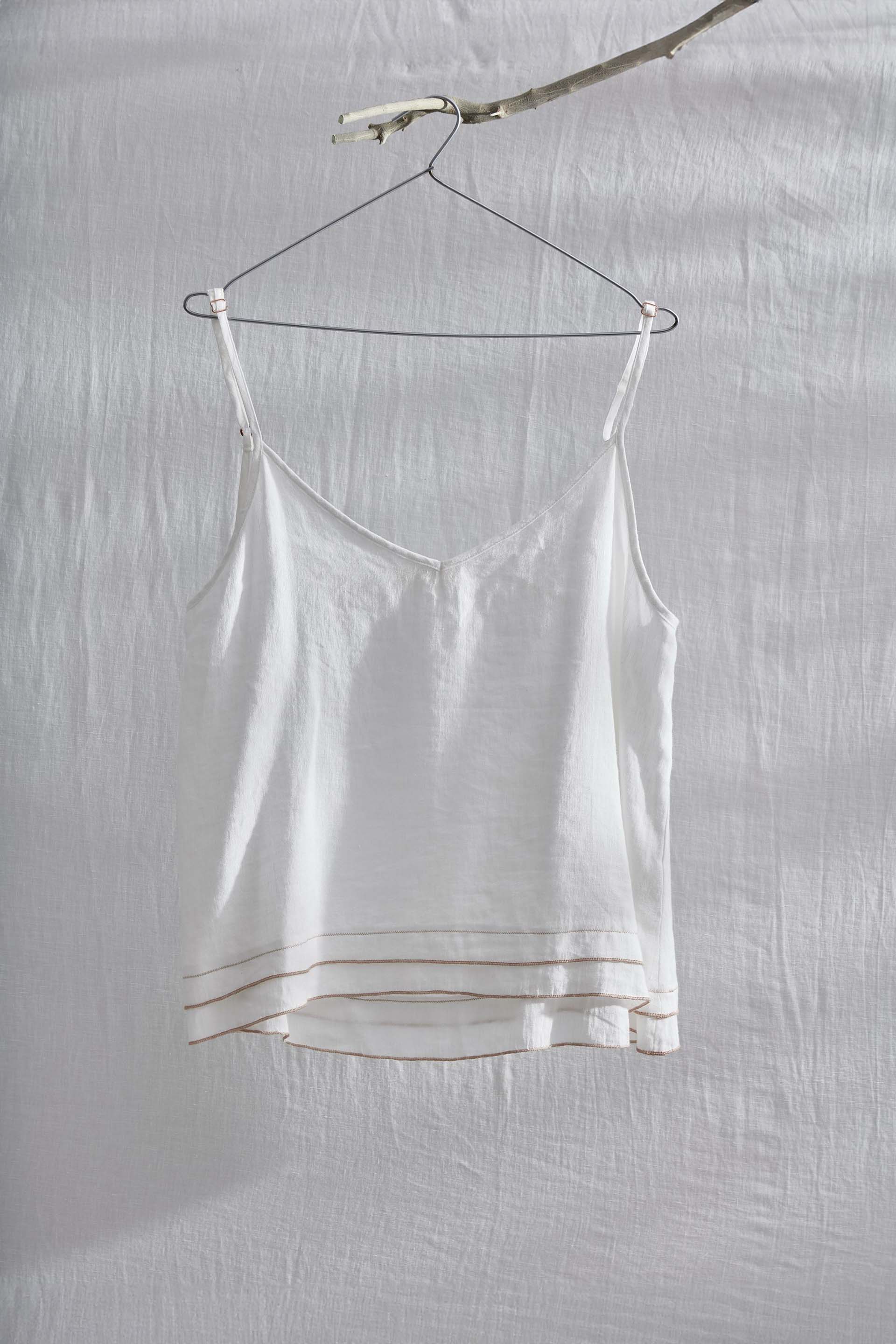 Woven from 30% Tencel™, 30% linen, and 40% cotton, it features fine stitched detailing along the hemline, adding texture and character to its minimalist design. The lightweight, breathable fabric drapes softly, offering all-day comfort and understated elegance.